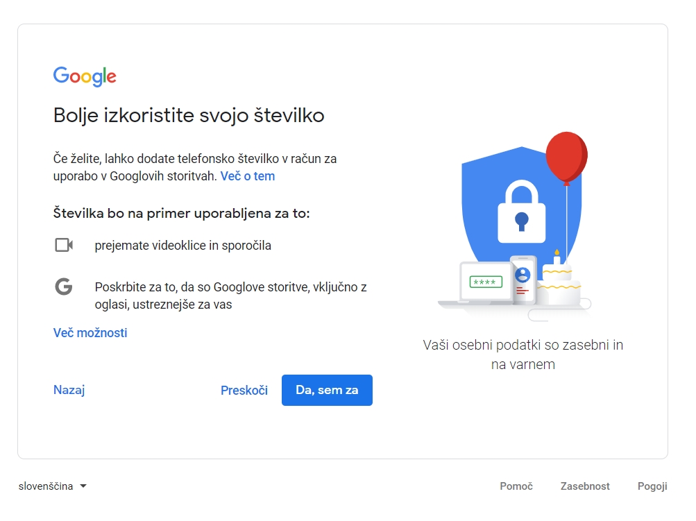 v Googlu - naš novi e-naslov je narejen, tako v okno Telefonska števila (izbirno) vpišemo našo mobilno številko