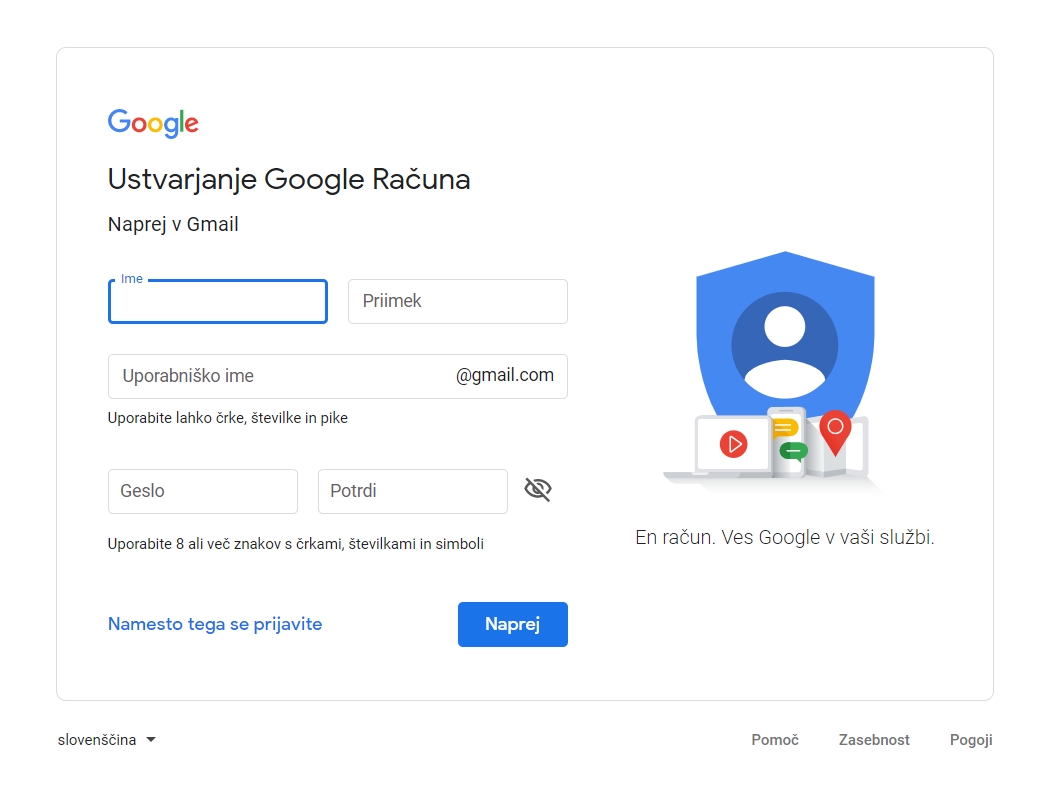 Prikaže se pozdravno okno v našem novem Google e-poštnem računu