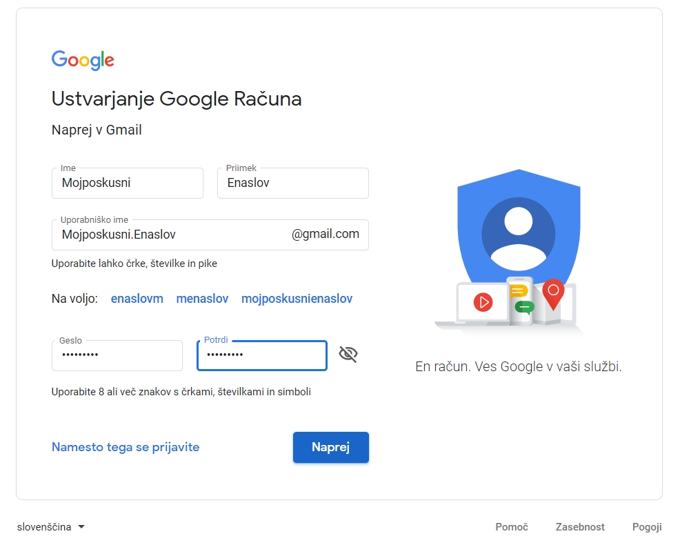 4. A v našem nazoren primeru bo IME: Mojposkusni in PRIIMEK: Enaslov