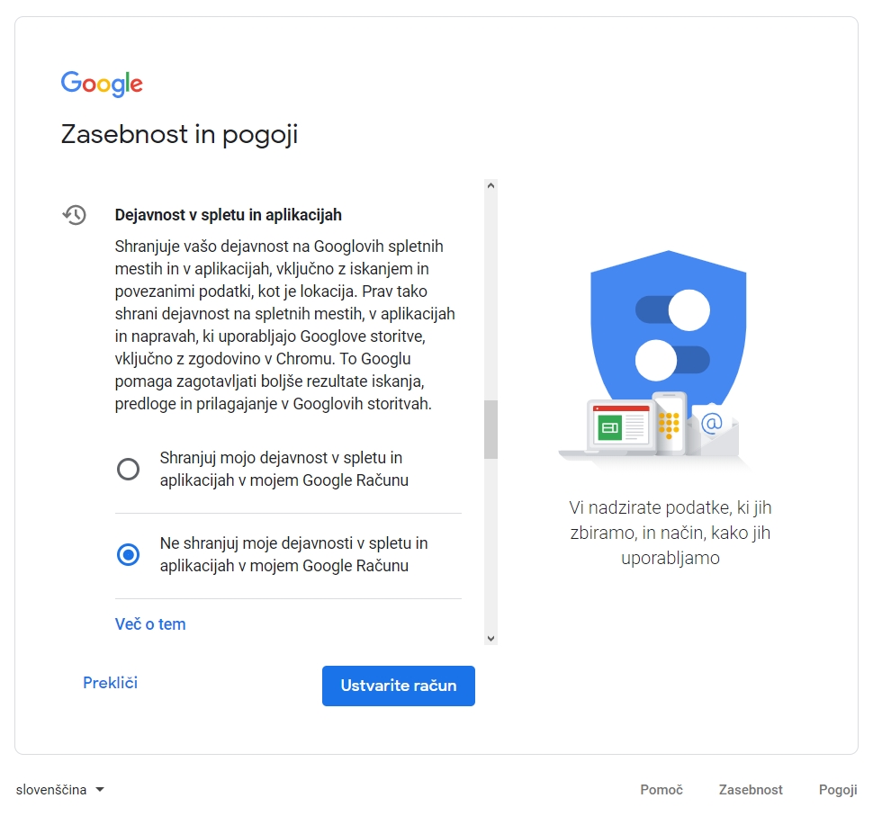 10. KORAK Odpre se okno - Zasebnost in pogoji,