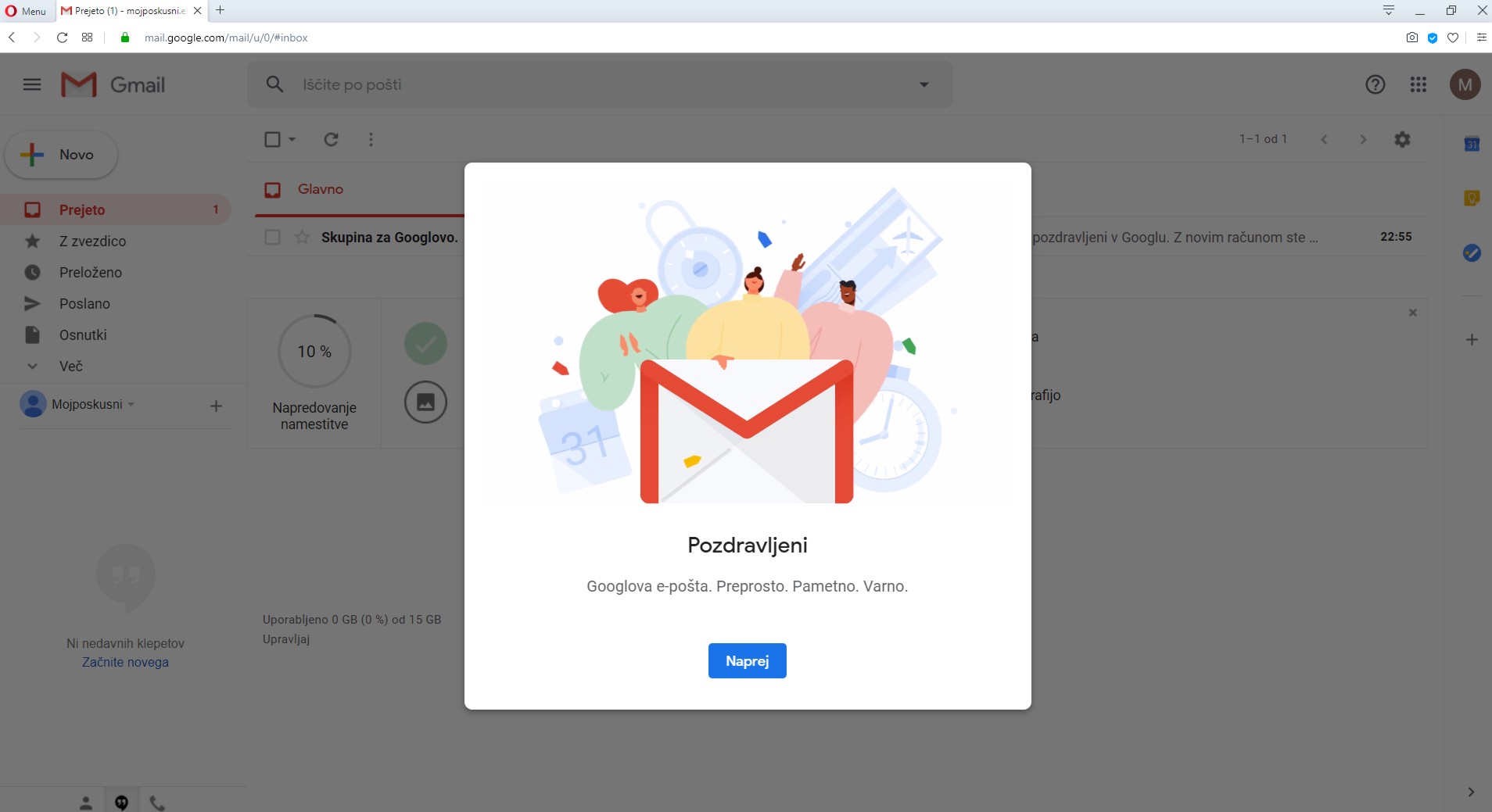 Prikaže se pozdravno okno v našem novem Google e-poštnem računu