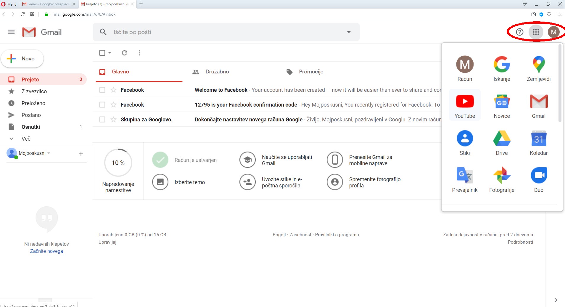 Ko se prijavimo v naš Google račun (e-pošto) se pomaknemo na desno